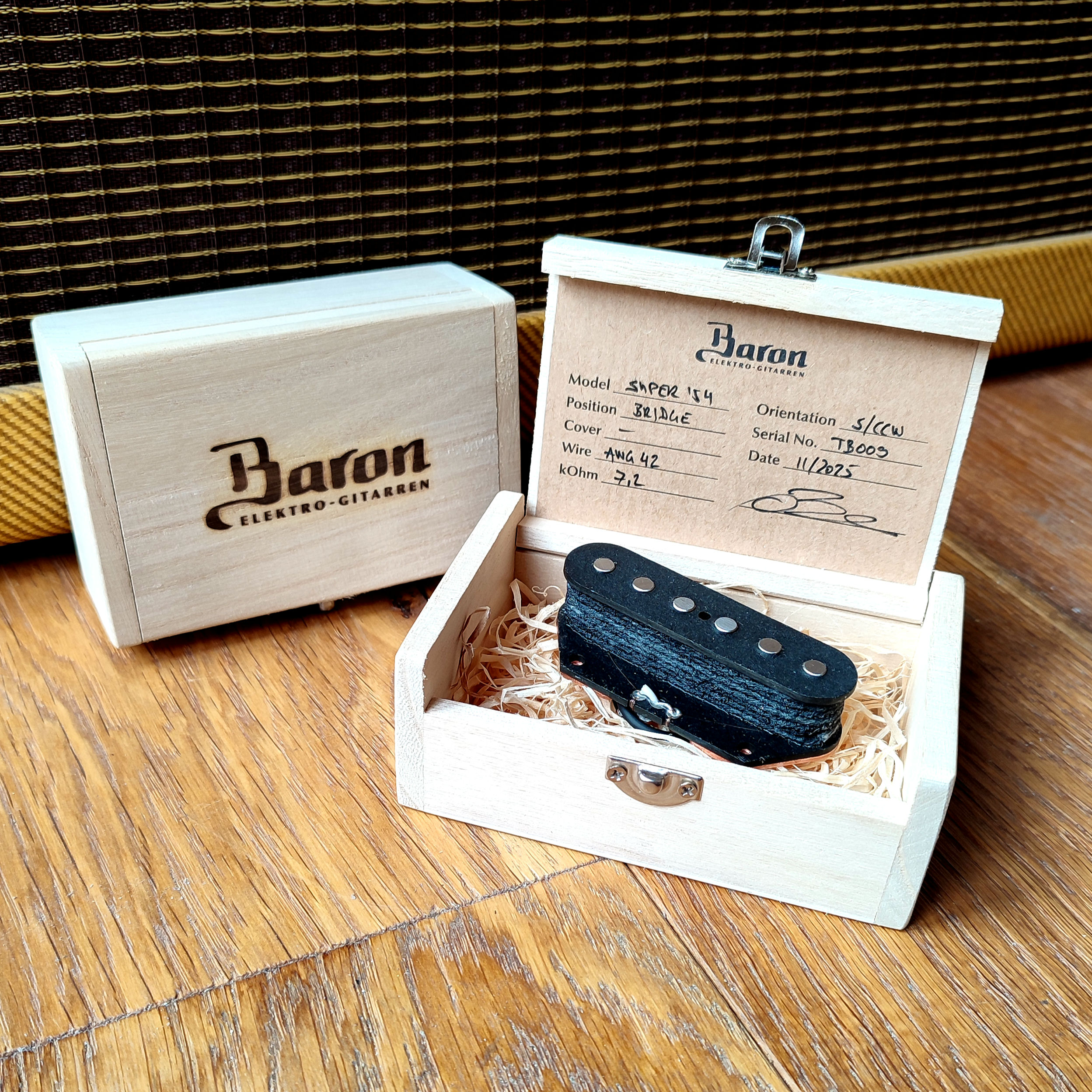 Baron bridge pickups are built with the south poles facing up and the coil being wound counter clockwise (RWRP) for hum-free sounds in the middle position. (Other winding and magnet orientations upon request.)